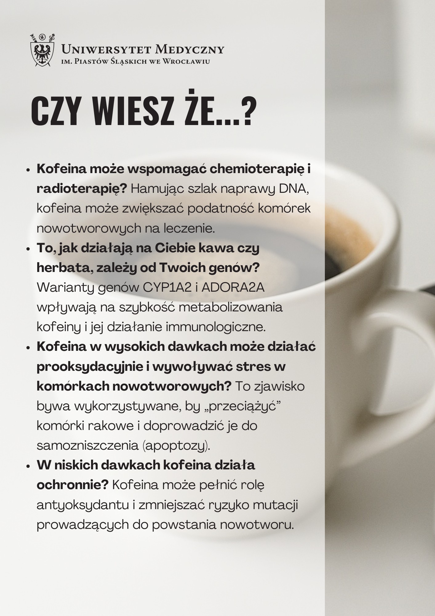 Okazuje się, że kofeina może również zaburzać cykl życia komórek nowotworowych, blokować mechanizmy naprawy DNA i zwiększać wrażliwość na chemioterapię. Może także działać prooksydacyjnie – wywoływać stres oksydacyjny, który dla zdrowych komórek bywa groźny, ale dla nowotworowych może być zabójczy.